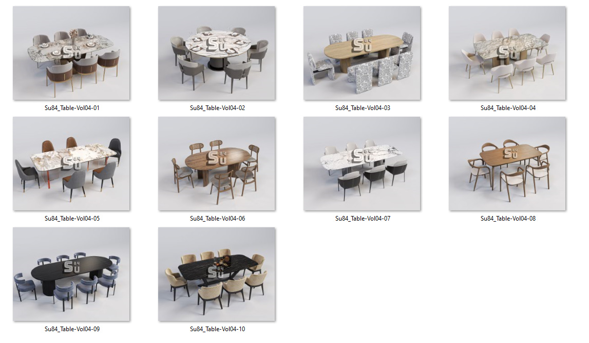 Thư viện bàn ăn Sketchup 3 Full vật liệu, full setting vray vantage. AE mua về chỉ việc kéo vào bài là xong không cần phải điều chỉnh bất cứ gì gồm có 10 bộ do trung tâm SU84 thiết lập.